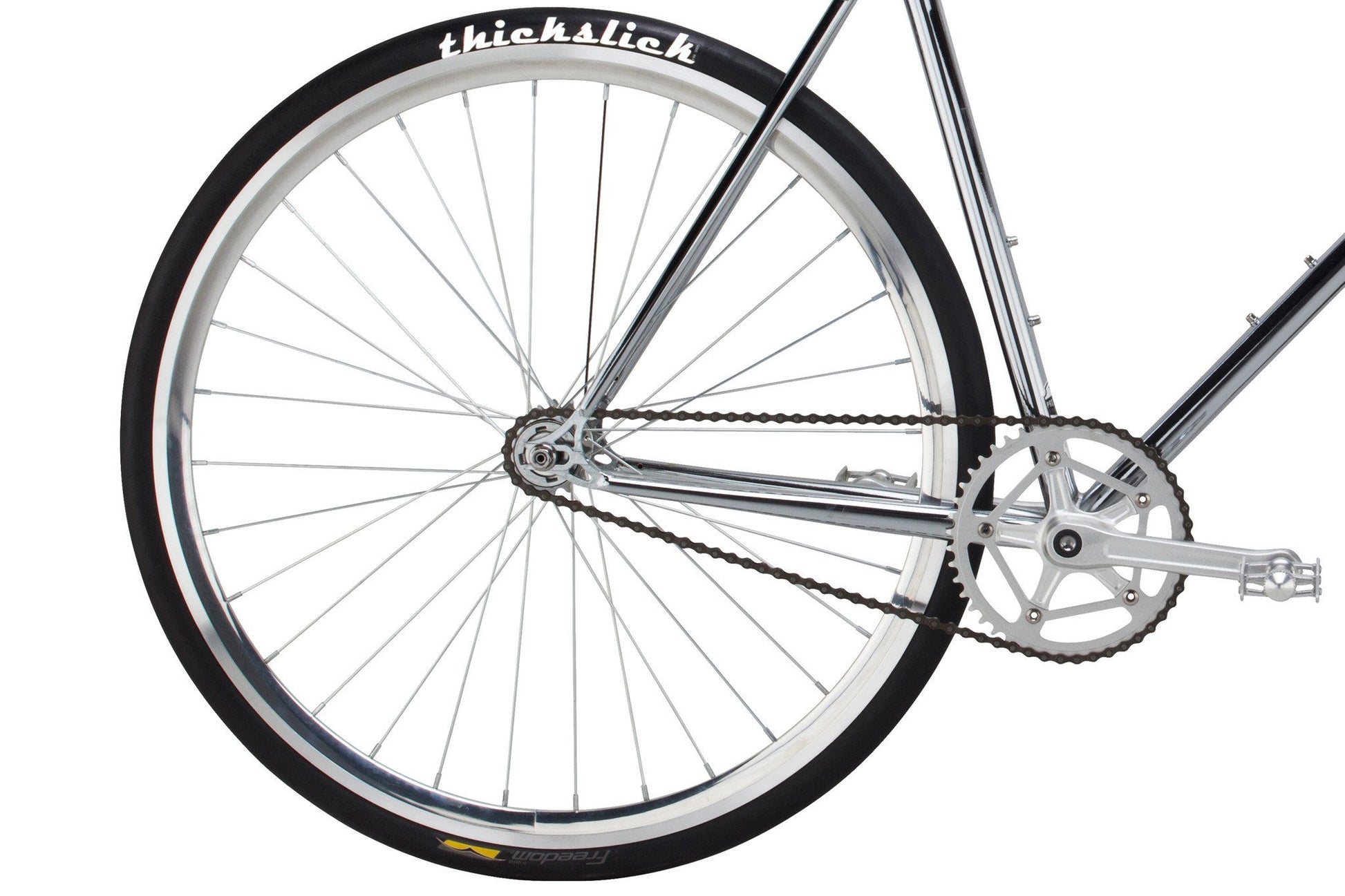 The Pure Fix Premium Series is the perfect bike to take your riding to the next level. Featuring a double-butted 4130 chromoly frame, the Premium Series was bred to be lighter, stiffer, and faster. It comes street-ready with wrapped drop bars, our 700C, 30mm wheelset featuring sealed bearing hubs and a machined braking surface, and includes Thickslick 700x28c tires standard. The raked chrome fork and polished silver quill stem and seat help bring a dash of classic style to a bike that's guaranteed to turn heads, warm hearts, and haul ass.