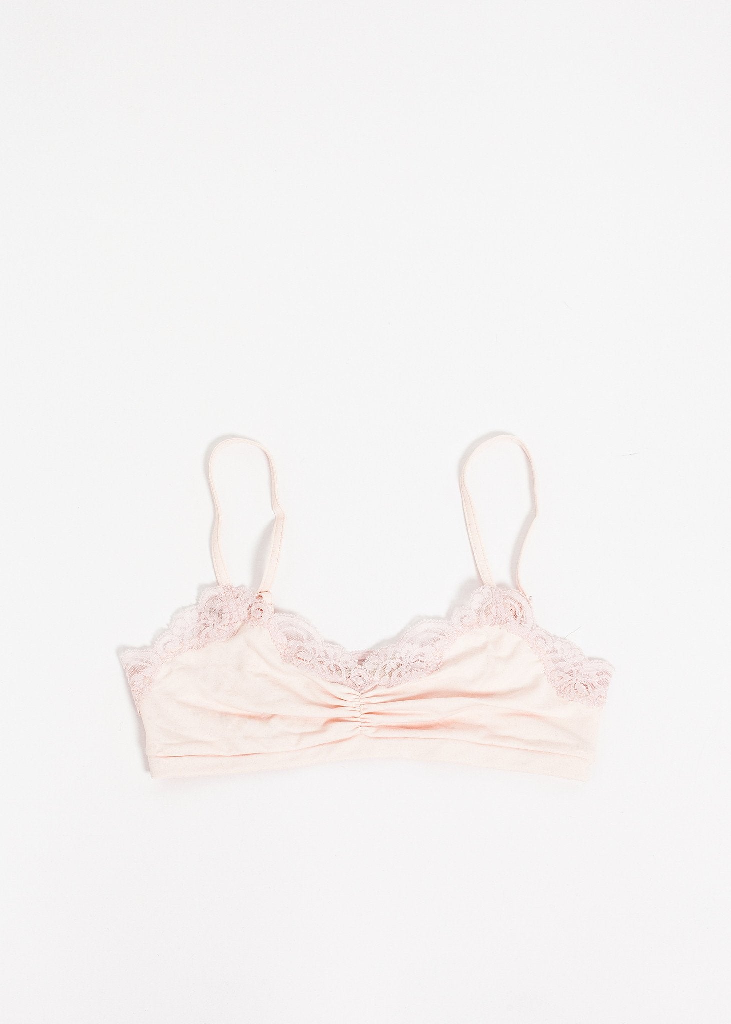The Ruche Bra from Only Hearts offers a delicate fit for your everyday needs with a fun lace trim. Color Barely Pink. 90% Nylon, 10% Lycra. Made in U.S.A.